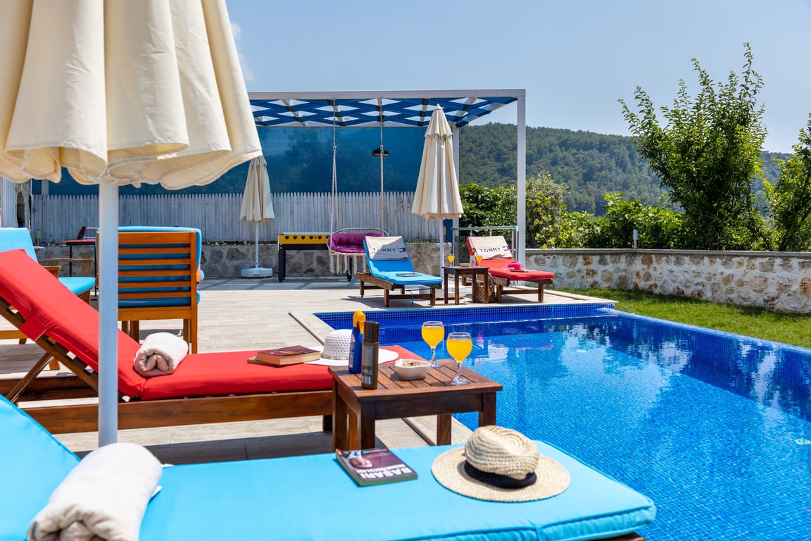Villa Araf, Kalkan Üzümlü bölgesinde konumlanmakta olan, yeşilliklerle kaplı doğa manzarasına hâkim kiralık villalarımız arasında yer almaktadır. Lüks ve modern bir şekilde dizayn edilen villamızda 2 adet yatak odası bulunmakta olup, 4 kişiye konaklama imkânı sağlamaktadır. Yatak odalarının bir tanesinde, tüm yılın vermiş olduğu yorgunluğu giderebileceğiniz jakuzi yer almaktadır. Havuz ve havuz terası korunaklı hale getirilen yazlık villamızı muhafazakâr aileler gönül rahatlığıyla tercih edebilirler. Hayallerinizin de ötesinde keyif dolu bir yaz tatili için Villa Araf’ı tercih edebilirsiniz.