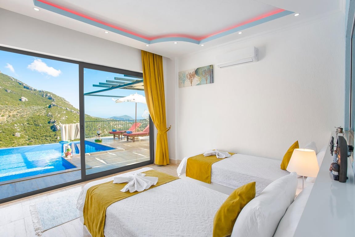 Villa Dimare 1, Kalkan İslamlar bölgesinde konumlanmakta olan, yeşilliklerle kaplı doğa manzarasına hâkim kiralık villalarımız arasında yer almaktadır. Lüks ve modern bir şekilde dizayn edilen villamızda 2 adet yatak odası bulunmakta olup, 4 kişiye konaklama imkânı sağlamaktadır. Yatak odalarından bir tanesinin içerisinde tüm yılın vermiş olduğu yorgunluğu giderebileceğiniz jakuzi yer almaktadır. Aynı zamanda kış aylarında tatil planı yapmak isteyen misafirlerimiz için kapalı ısıtma havuzu yer almaktadır. Havuz ve havuz terası korunaklı hale getirilen yazlık villamızı muhafazakâr aileler gönül rahatlığı ile tercih edebilirler. Hayallerinizin de ötesinde keyif dolu bir yazlık villada tatil için Villa Dimare 1’i tercih edebilirsiniz.