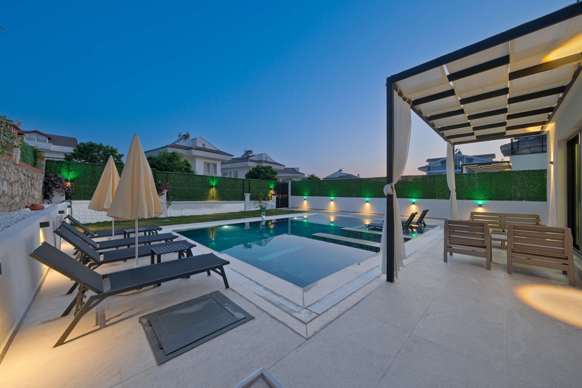Havuzlu Kiralık Villa Doğa İle İç İçe Fethiye Kiralık Villa Kalabalık Aileler İçin Uygun Villa Muğla Kiralık Villa Jakuzili Balayı Kiralık Villa Balayı Villası Dağ Manzaralı Sığ ve Çocuk Havuzlu Villa