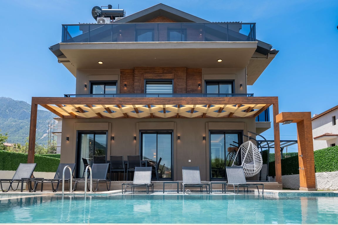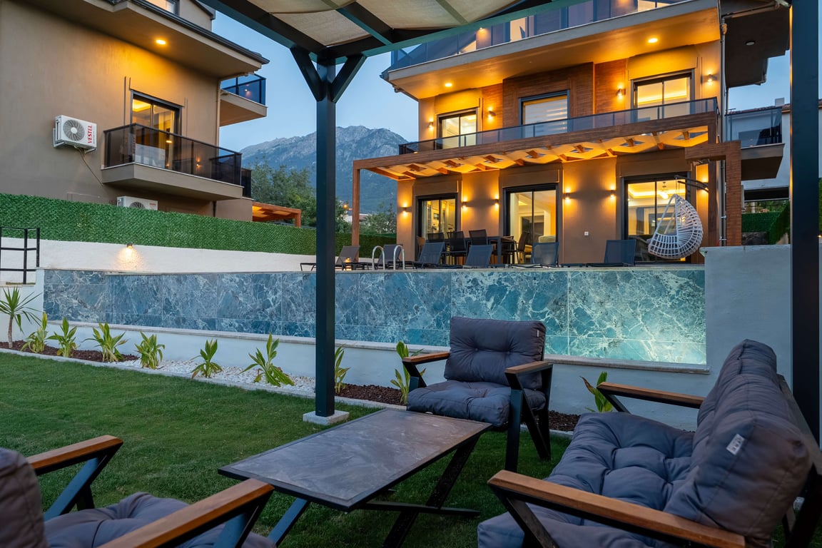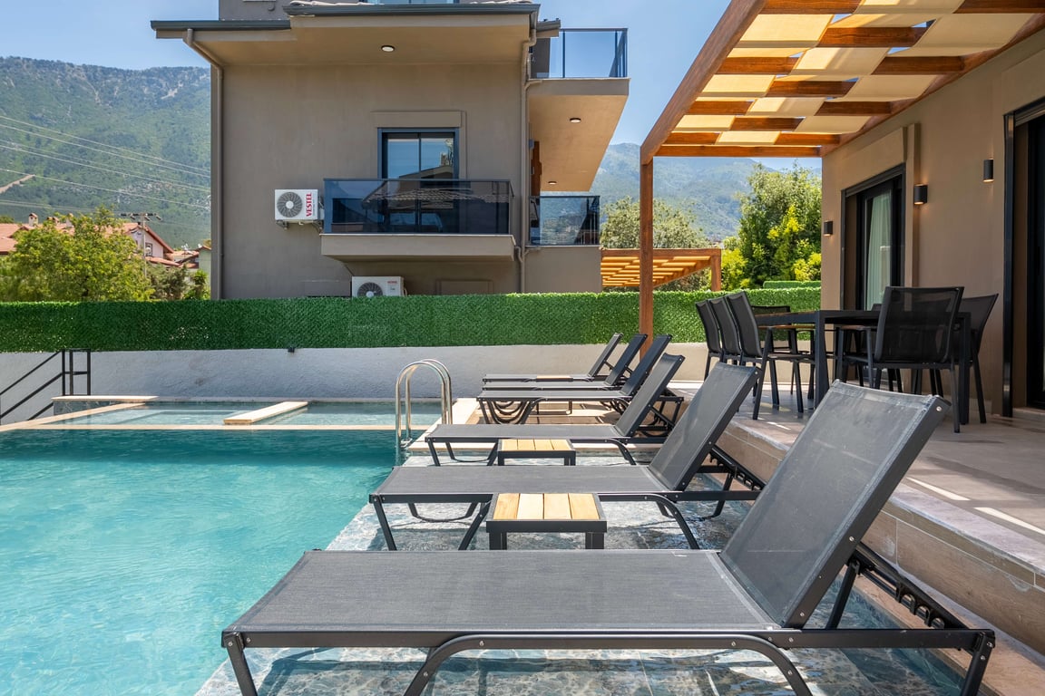 Villa Maison, Fethiye Ölüdeniz Ovacık bölgesinde konumlanmakta olan, yeşilliklerle kaplı doğa manzarasına hakim kiralık villalarımız arasında yer almaktadır. Lüks ve modern bir şekilde dizayn edilen villamızda 4 adet yatak odası bulunmakta olup, 8 kişiye konaklama imkanı sağlamaktadır. Havuz bölümünde jakuzi ve çocuk havuzu da yer almaktadır.
