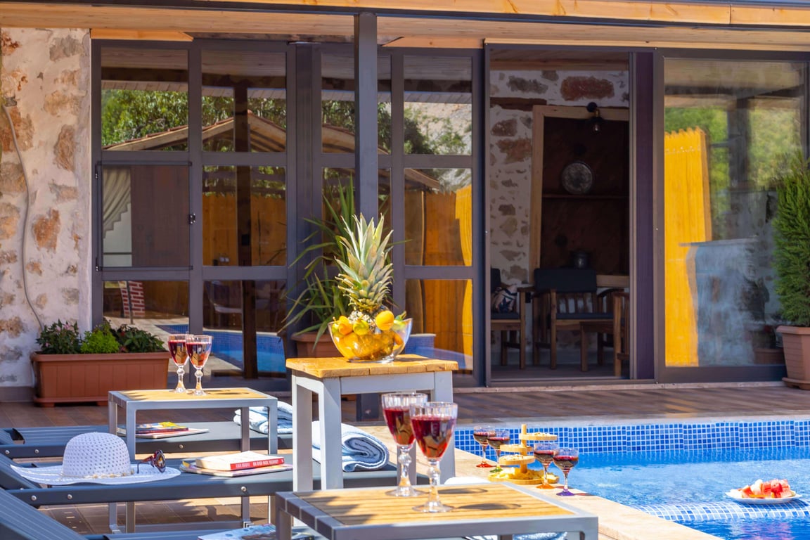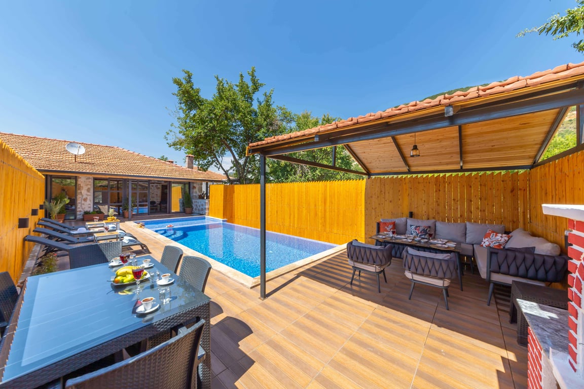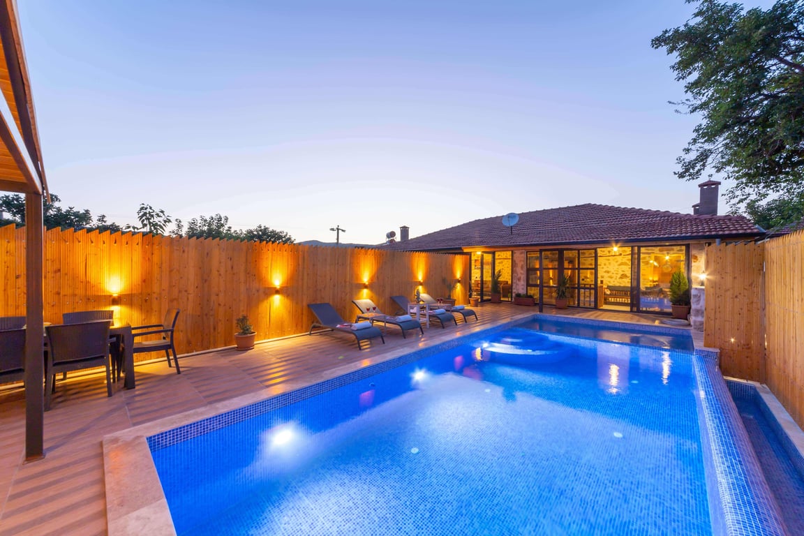 Villa Nostalji, Kalkan Bezirgan bölgesinde, yeşilliklerle kaplı doğa manzarasına hakim kiralık villalarımız arasında yer almaktadır. Lüks ve modern bir şekilde dizayn edilen villamızda 3 adet yatak odası bulunmakta olup, 7 kişiye konaklama imkanı sağlamaktadır. Yatak odalarının iki tanesinde jakuzi bulunmakta olup, yılın yorgunluğunu atmanız için özel olarak düşünülmüştür. Villamızda ayrıca kapalı havuz, sauna ve hamam yer almaktadır. Havuz ve havuz terası korunaklı hale getirilen yazlık villamızı muhafazakar aileler gönül rahatlığı ile tercih edebilirler. Hayallerinizin de ötesinde keyif dolu bir yazlık villada tatil için Villa Nostalji’yi tercih edebilirsiniz.