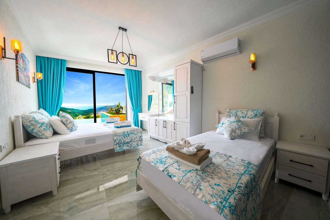 - 2- 1 çift kişilik yatak, 1 tek kişilik yatak, özel banyo/WC