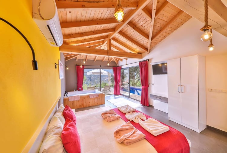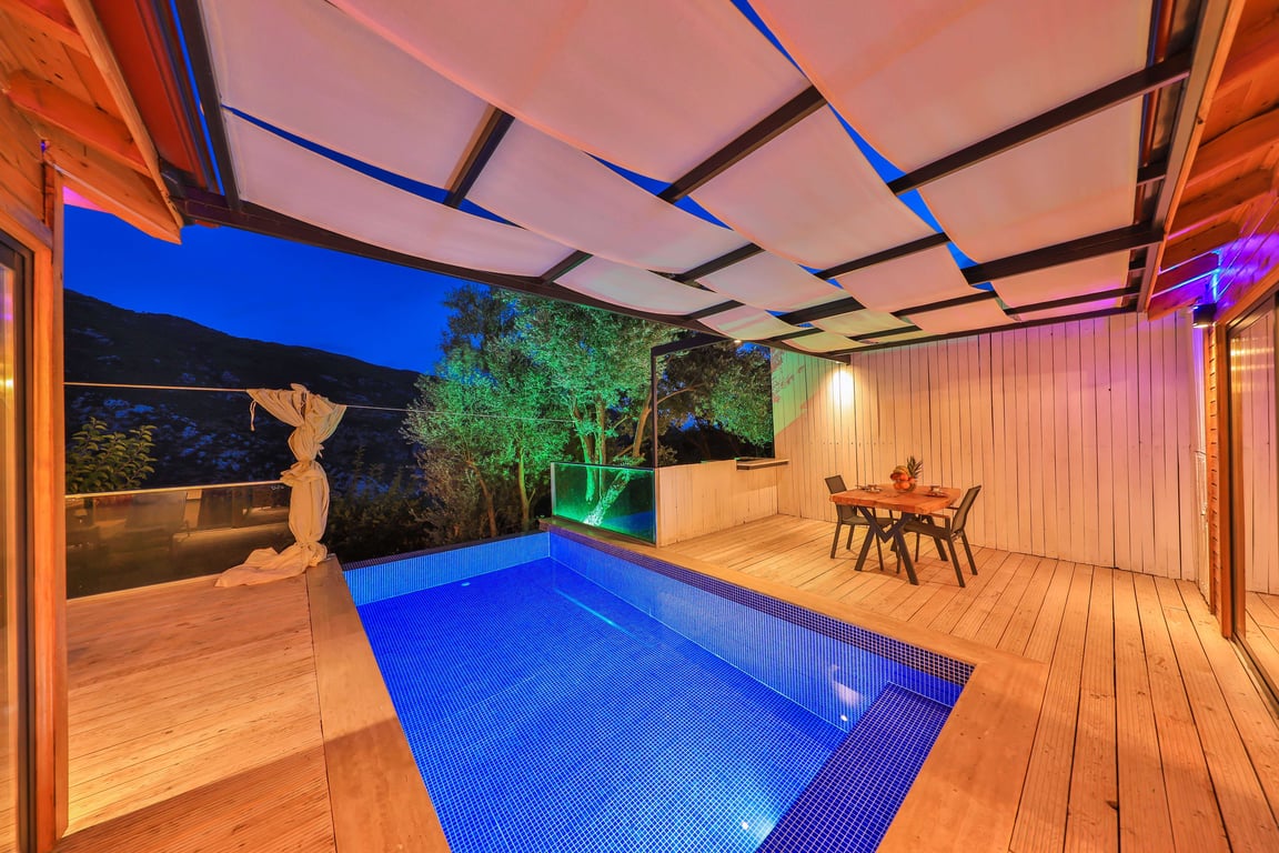 Villa Abanoz, Kalkan İslamlar bölgesinde konumlanmakta olan, yeşilliklerle kaplı doğa manzarasına hâkim kiralık villalarımız arasında yer almaktadır. Lüks ve modern bir şekilde dizayn edilen villamızda 1 adet yatak odası bulunmakta olup, 2 kişiye konaklama imkânı sağlamaktadır. Yatak odasının içerisinde tüm yılın vermiş olduğu yorgunluğu giderebileceğiniz jakuzi yer almaktadır. Havuz ve havuz terası korunaklı hale getirilen yazlık villamızı muhafazakâr aileler gönül rahatlığı ile tercih edebilirler. Hayallerinizin de ötesinde keyif dolu bir yazlık villada tatil için Villa Abanoz'u tercih edebilirsiniz.