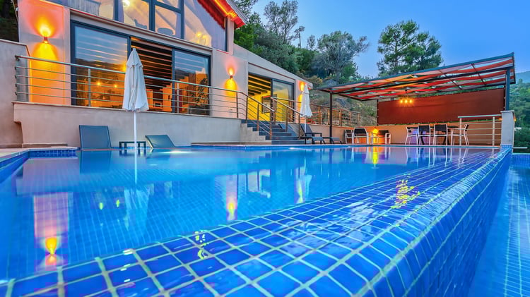 Villa Aras, Kalkan İslamlar bölgesinde konumlanmakta olan, muhteşem deniz ve yeşilliklerle kaplı doğa manzarasına hakim kiralık villalarımız arasında yer almaktadır. Lüks ve modern bir şekilde dizayn edilen villamızda 2 adet yatak odası bulunmakta olup, 4 kişiye konaklama imkanı sağlamaktadır. Yatak odalarından bir tanesinin içerisinde, tüm yılın vermiş olduğu yorgunluğu giderebileceğiniz jakuzi yer almaktadır. Havuz ve havuz terası korunaklı hale getirilen yazlık villamızı muhafazakar aileler gönül rahatlığı ile tercih edebilirler. Hayallerinizin de ötesinde keyif dolu bir yazlık villada tatil için Villa Aras'ı tercih edebilirsiniz.
