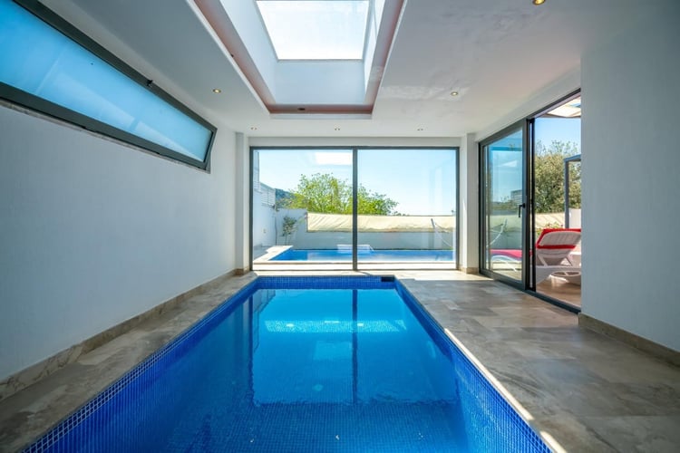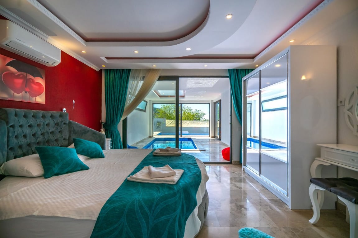 Villa Aşkım, Kalkan Üzümlü bölgesinde konumlanmakta olan yeşilliklerle kaplı doğa manzarasına hakim kiralık villalarımız arasında yer almaktadır. Lüks ve modern bir şekilde dizayn edilen villamızda 2 adet yatak odası bulunmakta olup, 4 kişiye konaklama imkanı sağlamaktadır. Yatak odalarının bir tanesinde tüm yılın vermiş olduğu yorgunluğu giderebileceğiniz jakuzi yer almaktadır. Havuz ve havuz terası korunaklı hale getirilen yazlık villamızı muhafazakar aileler gönül rahatlığı ile tercih edebilirler. Hayallerinizin de ötesinde keyif dolu bir yazlık villada tatil için Villa Aşkım'ı tercih edebilirsiniz.