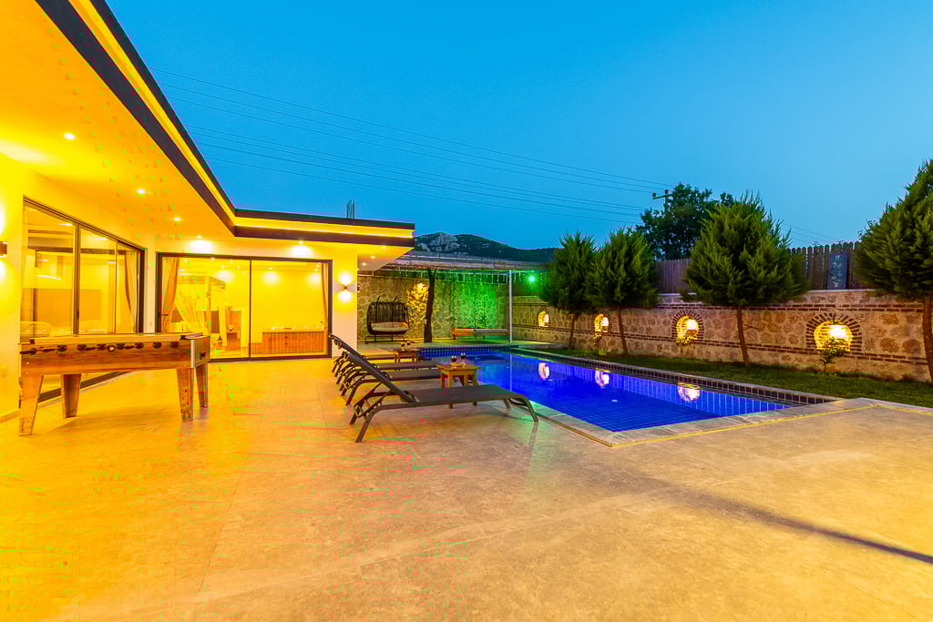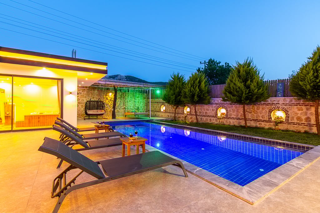 Villa Cigaday, Kalkan Sarıbelen bölgesinde konumlanmakta olan yeşilliklerle kaplı doğa manzarasına hakim kiralık villalarımız arasında yer almaktadır. Lüks ve modern bir şekilde dizayn edilen villamızda 2 adet yatak odası bulunmakta olup, 5 kişiye konaklama imkanı sağlamaktadır. Yatak odalarından bir tanesinin içerisinde tüm yılın vermiş olduğu yorgunluğu giderebileceğiniz jakuzi yer almaktadır. Havuz ve havuz terası korunaklı hale getirilen yazlık villamızı muhafazakar aileler gönül rahatlığı ile tercih edebilirler. Hayallerinizin de ötesinde keyif dolu bir yazlık villada tatil için Villa Cigaday'ı tercih edebilirsiniz.