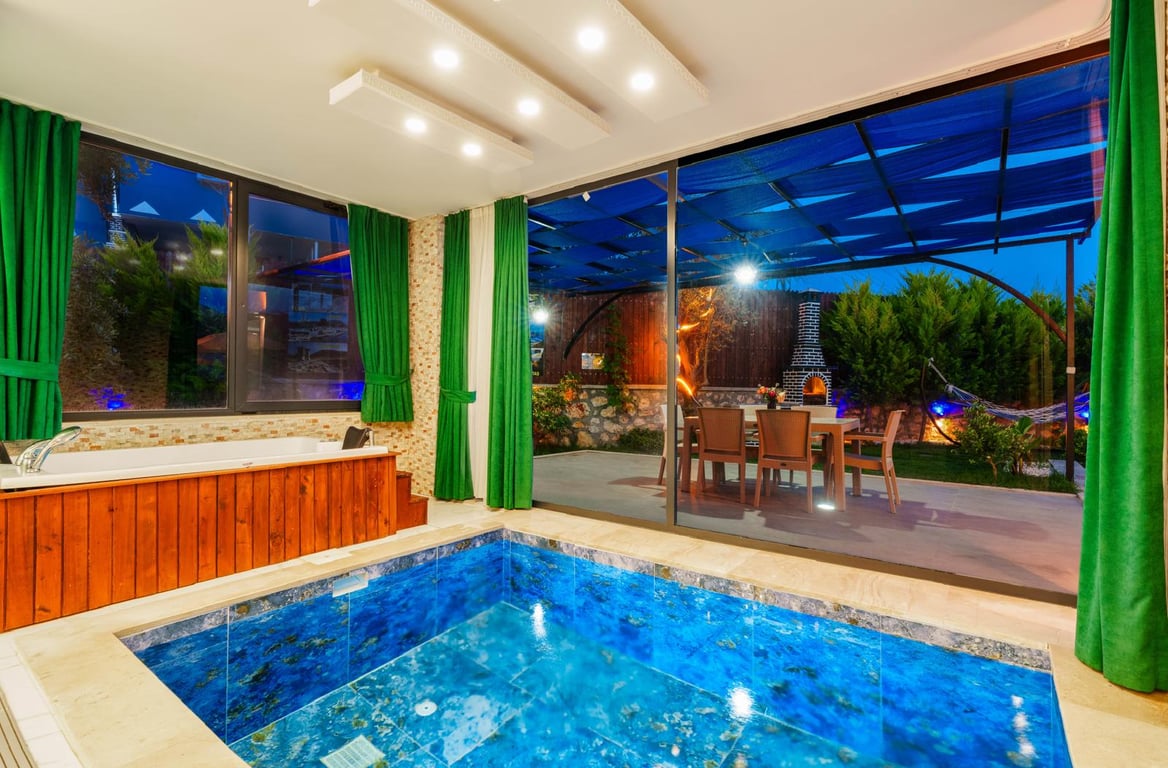 Villa Elena, Kalkan Çavdır bölgesinde konumlanmakta olup, yeşilliklerle kaplı doğa manzarasına hakim kiralık villalarımız arasında yer almaktadır. Lüks ve modern bir şekilde dizayn edilen villamızda 2 adet yatak odası bulunmakta olup, 4 kişiye konaklama imkanı sağlamaktadır. Yatak odalarından birinde, tüm yılın yorgunluğunu giderebileceğiniz jakuzi yer almaktadır. Ayrıca, kış aylarında tatil planı yapan misafirlerimiz için kapalı havuz, sauna ve hamam bulunmaktadır. Havuz ve havuz terası korunaklı hale getirilen villamız, muhafazakar aileler tarafından gönül rahatlığıyla tercih edilebilir. Hayallerinizin ötesinde keyif dolu bir tatil için Villa Elena’yı tercih edebilirsiniz.