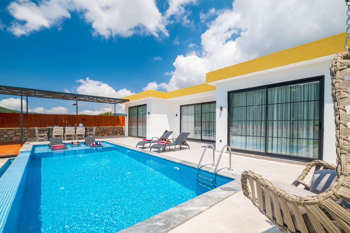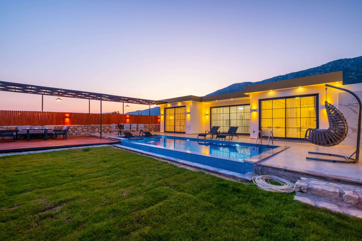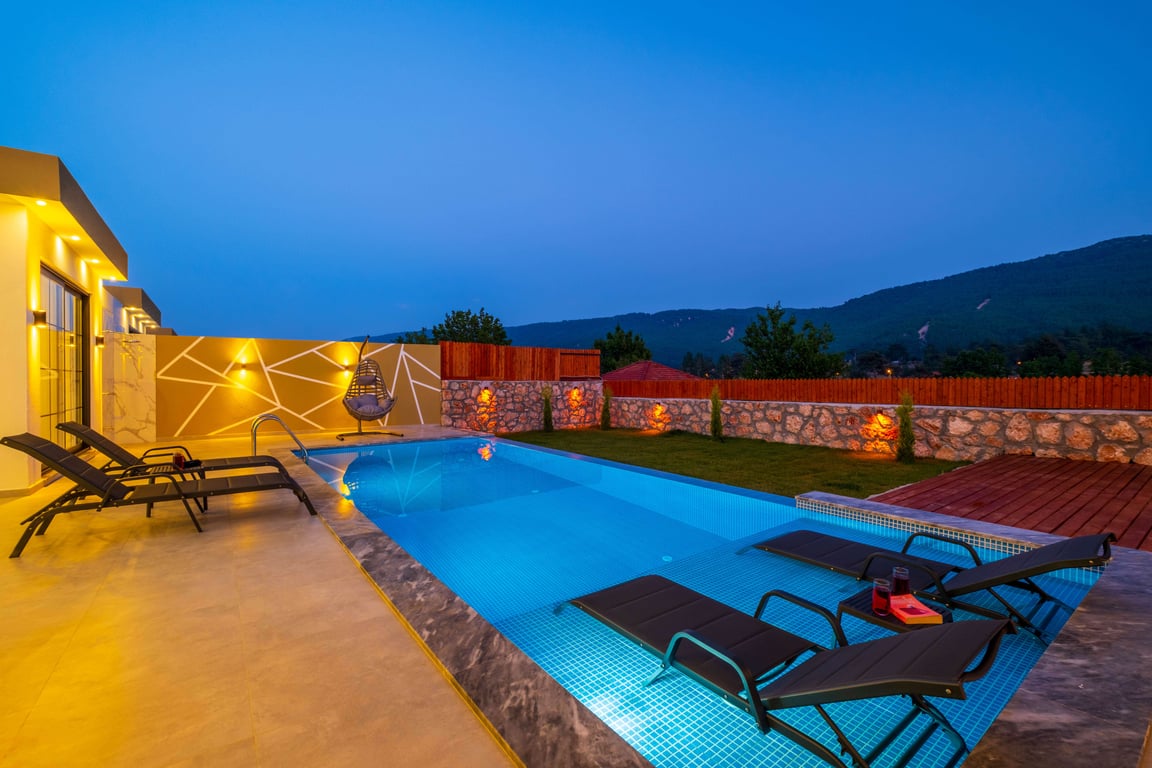 Villa Golden Duo, Kalkan Sarıbelen bölgesinde konumlanmakta olup, yeşilliklerle çevrili doğa manzarasına hakim kiralık villalarımız arasında yer almaktadır. Lüks ve modern bir şekilde tasarlanan villamızda 3 adet yatak odası bulunmakta olup, 6 kişiye konaklama imkânı sunmaktadır. Yatak odalarından birinde, tüm yılın yorgunluğunu atabileceğiniz jakuzi yer almaktadır. Havuz ve havuz terası korunaklı hale getirilen villamız, muhafazakar aileler tarafından gönül rahatlığıyla tercih edilebilir. Doğayla iç içe huzurlu ve konforlu bir tatil için Villa Golden Duo’yu tercih edebilirsiniz.