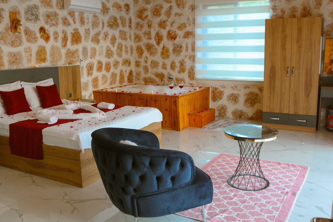 1-Çift kişilik yatak, banyo/wc, jakuzi ve bebek yatağı bulunmaktadır.