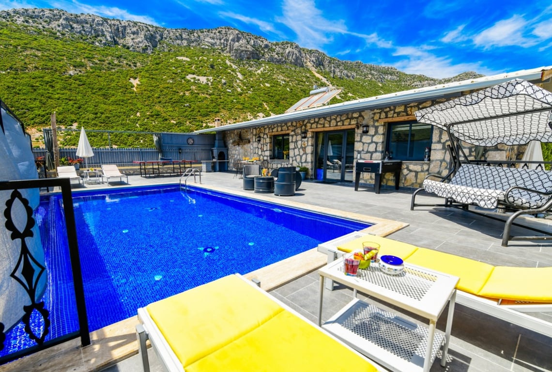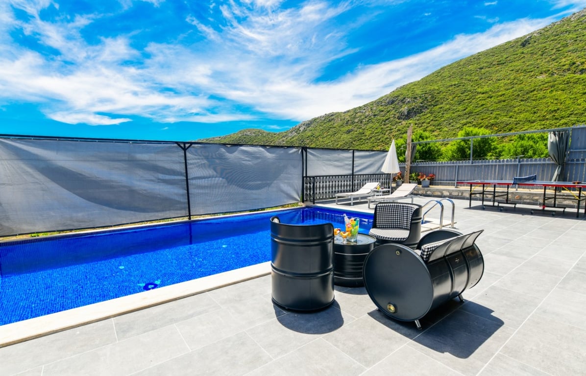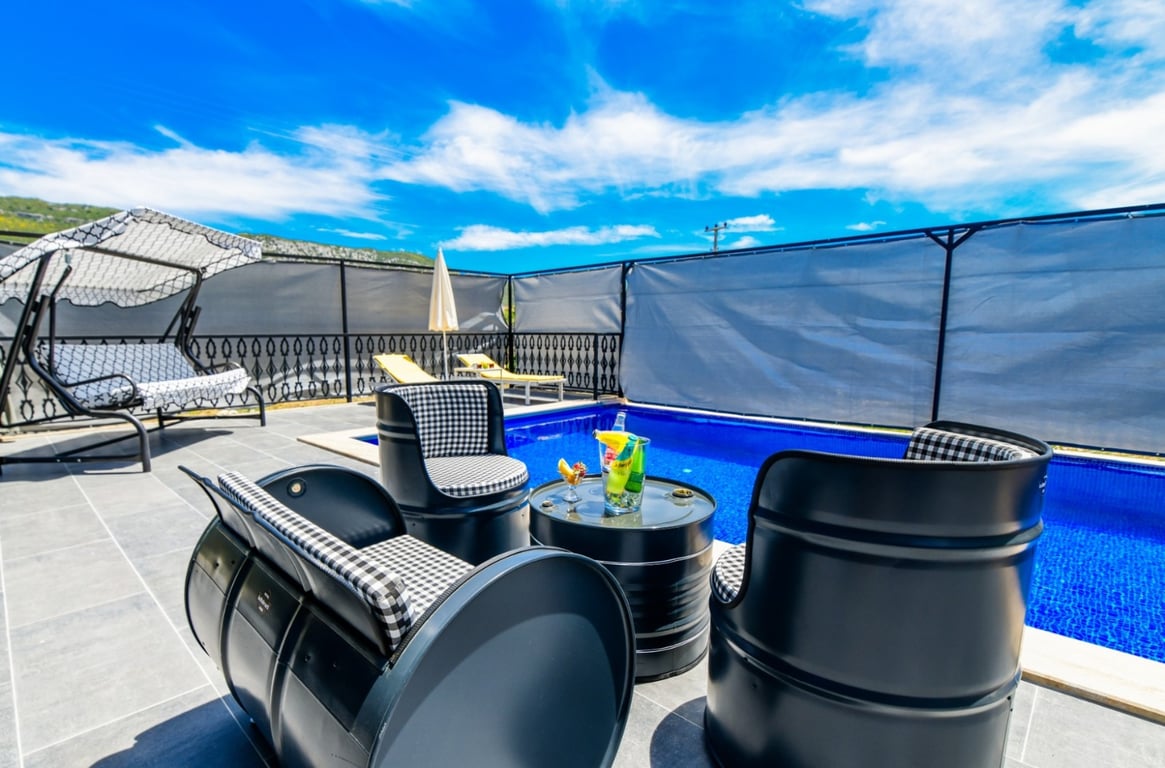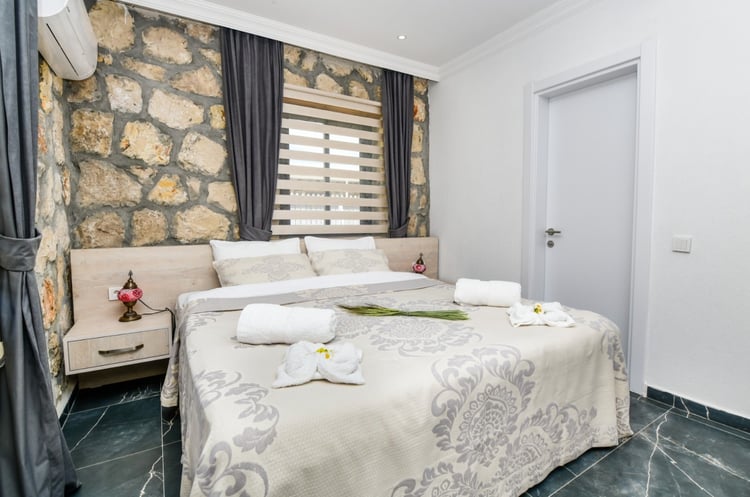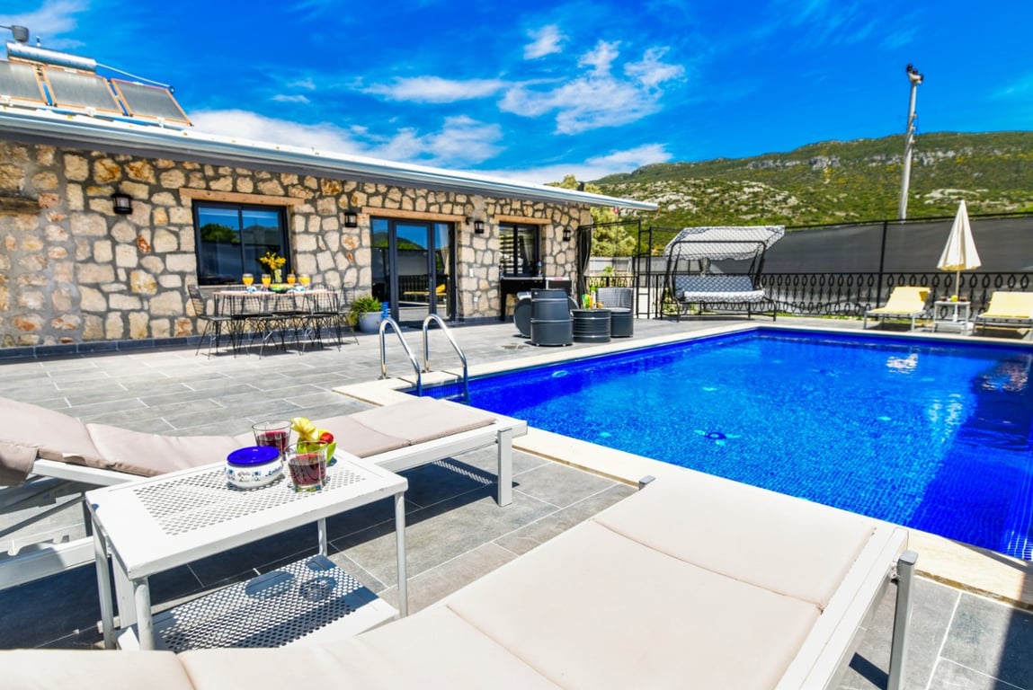 Villa Mavi Boncuk, Kalkan Bezirgan bölgesinde konumlanmakta olan yeşilliklerle kaplı doğa manzarasına hakim kiralık villalarımız arasında yer almaktadır. Lüks ve modern bir şekilde dizayn edilen villamızda 2 adet yatak odası bulunmakta olup, 4 kişiye konaklama imkanı sağlamaktadır. Yatak odalarından bir tanesinin içerisinde tüm yılın vermiş olduğu yorgunluğu giderebileceğiniz jakuzi yer almaktadır. Havuz ve havuz terası korunaklı hale getirilen yazlık villamızı muhafazakar aileler gönül rahatlığı ile tercih edebilirler. Hayallerinizin de ötesinde keyif dolu bir yazlık villada tatil için Villa Mavi Boncuk'u tercih edebilirsiniz.