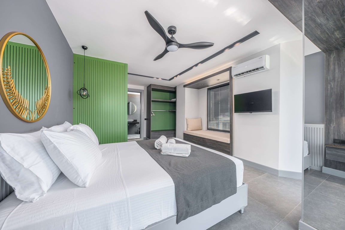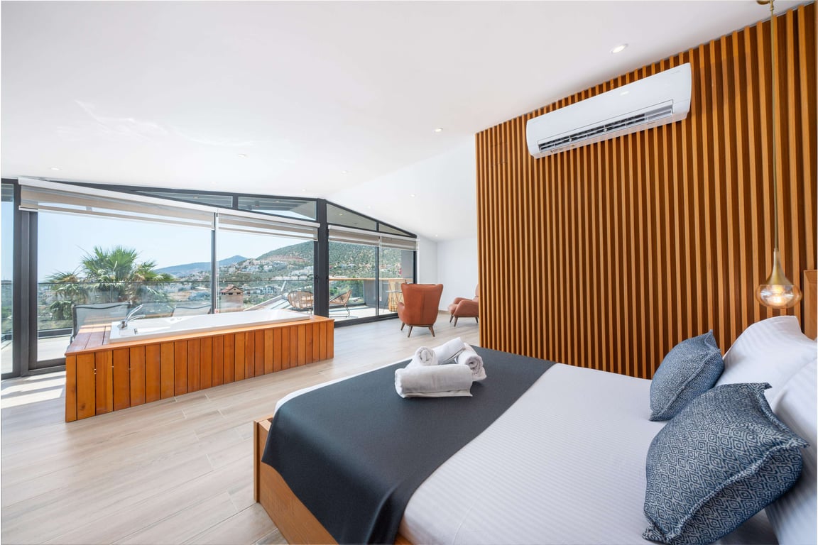 1-Çift kişilik yatak, banyo/WC ve jakuzi bulunmaktadır. Bu yatak odası çatı katında yer almakta olup, geniş teras ve bar alanı da bu katta bulunmaktadır.