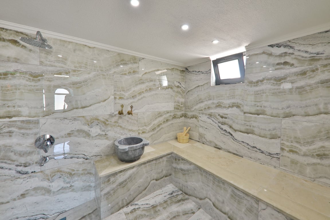 Villa Sandak 1, Seydikemer Karadere bölgesinde konumlanmakta olan, yeşilliklerle kaplı doğa manzarasına hakim kiralık villalarımız arasında yer almaktadır. Lüks ve modern bir şekilde dizayn edilen villamızda 3 adet yatak odası bulunmakta olup, 6 kişiye konaklama imkanı sağlamaktadır. Yatak odalarından iki tanesinin içerisinde jakuzi yer almaktadır. Aynı zamanda kış aylarında tatil planı yapmak isteyen misafirlerimiz için kapalı ısıtma havuzu, hamam ve sauna yer almaktadır. Havuz ve havuz terası korunaklı hale getirilen yazlık villamızı muhafazakar aileler gönül rahatlığı ile tercih edebilirler. Hayallerinizin de ötesinde keyif dolu bir yazlık villada tatil için Villa Sandak 1'i tercih edebilirsiniz.