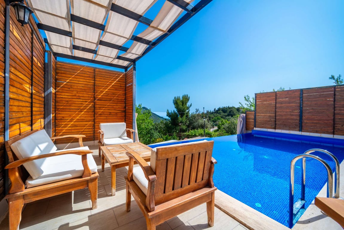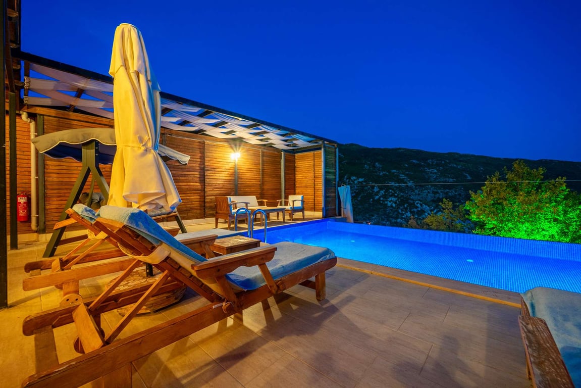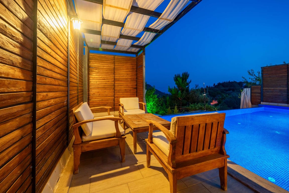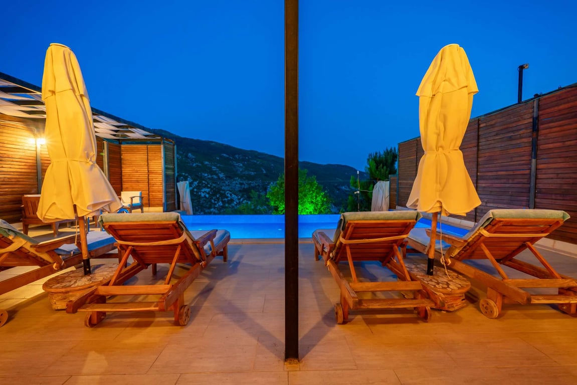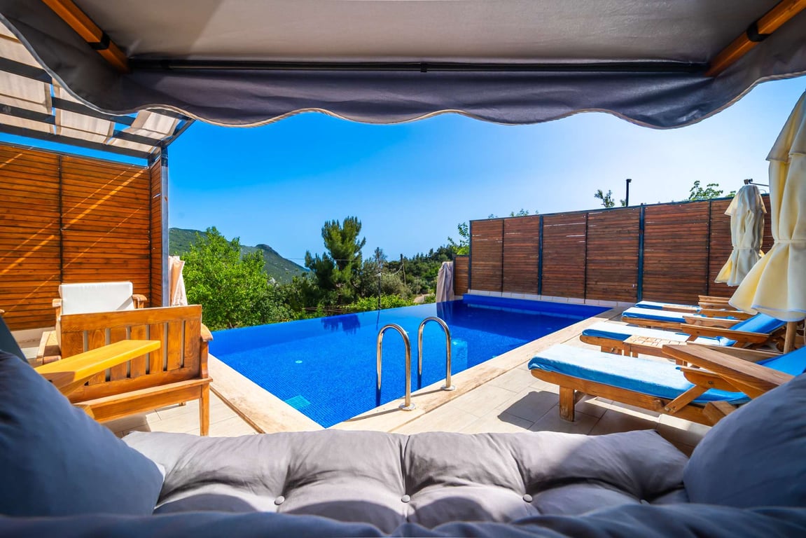 Villa Seyirtepe 2, Kalkan İslamlar bölgesinde konumlanmakta olan, yeşilliklerle kaplı doğa manzarasına hakim kiralık villalarımız arasında yer almaktadır. Aynı bölgede aynı tarzda inşa edilmiş ve dekore edilmiş 2 villamızdan bir tanesidir. Yana yana birlikte tatil yapmak isteyen misafirlerimiz için Villa Seyirtepe 1 ile birlikte kiralama yapılabilir. Konforlu ve modern bir şekilde dizayn edilen villamızda 2 adet yatak odası bulunmakta olup, 4 kişiye konaklama imkanı sağlamaktadır. Yatak odalarından bir tanesinin içerisinde tüm yılın vermiş olduğu yorgunluğu giderebileceğiniz jakuzi yer almaktadır. Havuz ve havuz terası korunaklı hale getirilen yazlık villamızı muhafazakar aileler gönül rahatlığı ile tercih edebilirler. Hayallerinizin de ötesinde keyif dolu bir yazlık villada tatil için Villa Seyirtepe 2’yi tercih edebilirsiniz.