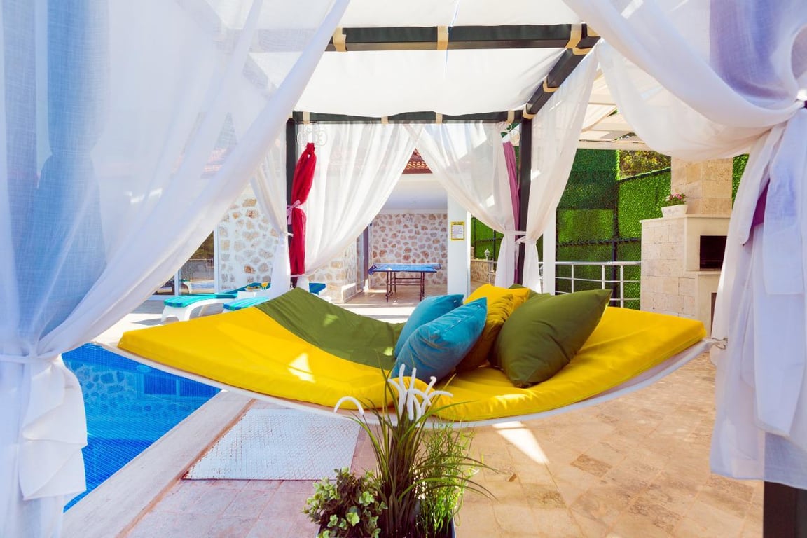 Villa Alya, Kalkan İslamlar bölgesinde konumlanmakta olan panoramik deniz ve yeşilliklerle kaplı doğa manzarasına hakim kiralık villalarımız arasında yer almaktadır. Lüks ve modern bir şekilde dizayn edilen villamızda 2 adet yatak odası bulunmakta olup, 4 kişiye konaklama imkanı sağlamaktadır. Yatak odalarından bir tanesinin içerisinde tüm yılın vermiş olduğu yorgunluğu giderebileceğiniz jakuzi yer almaktadır. Havuz ve havuz terası korunaklı hale getirilen yazlık villamızı muhafazakar aileler gönül rahatlığı ile tercih edebilirler. Villamız balayı çiftleri ve çekirdek aileler için uygundur. Hayallerinizin de ötesinde keyif dolu bir yazlık villada tatil için Villa Alya’ yı tercih edebilirsiniz.