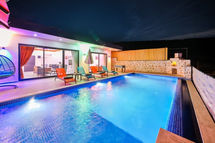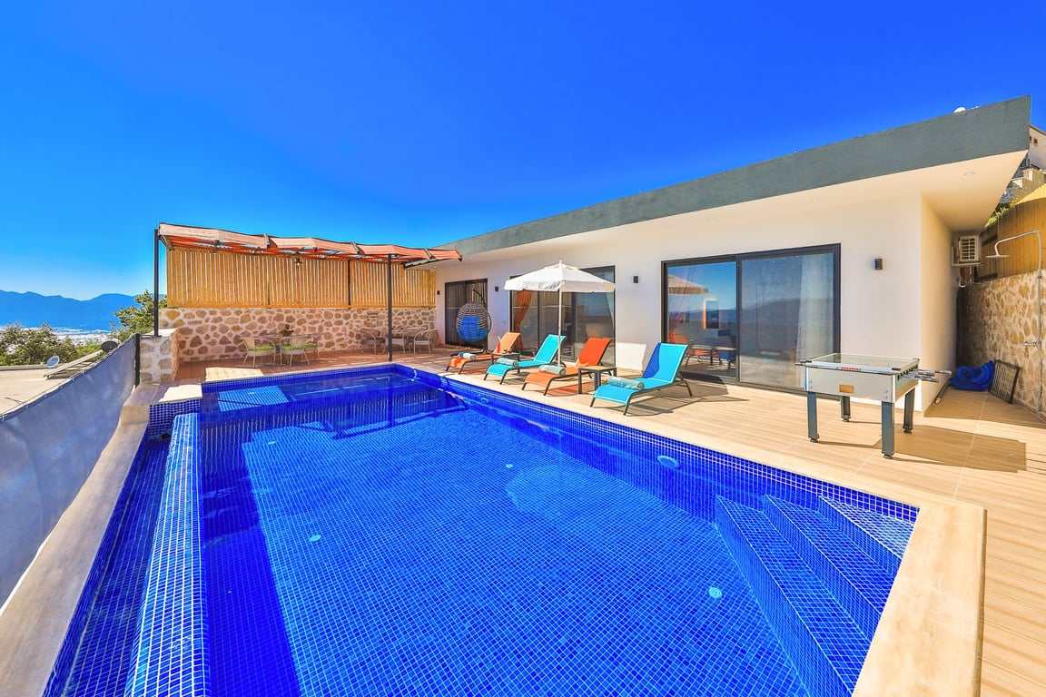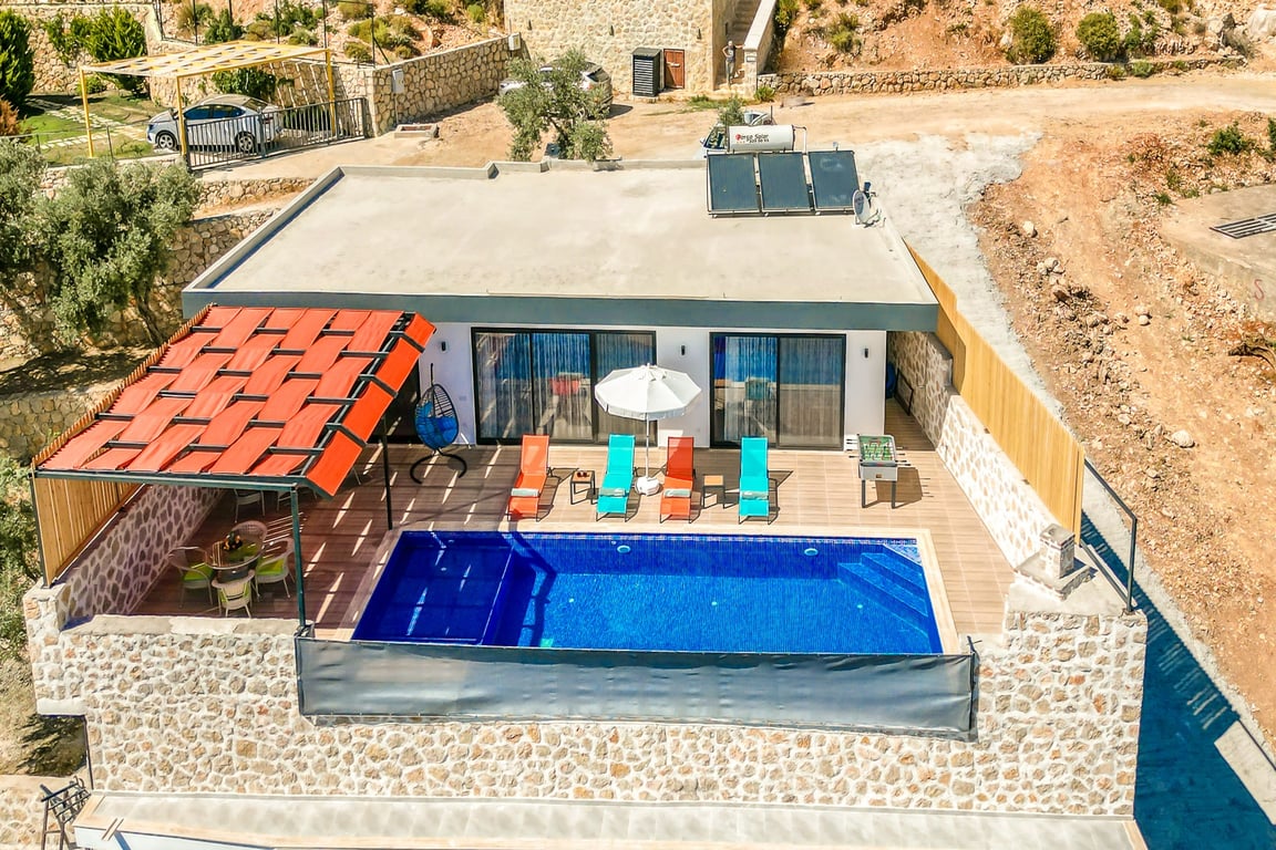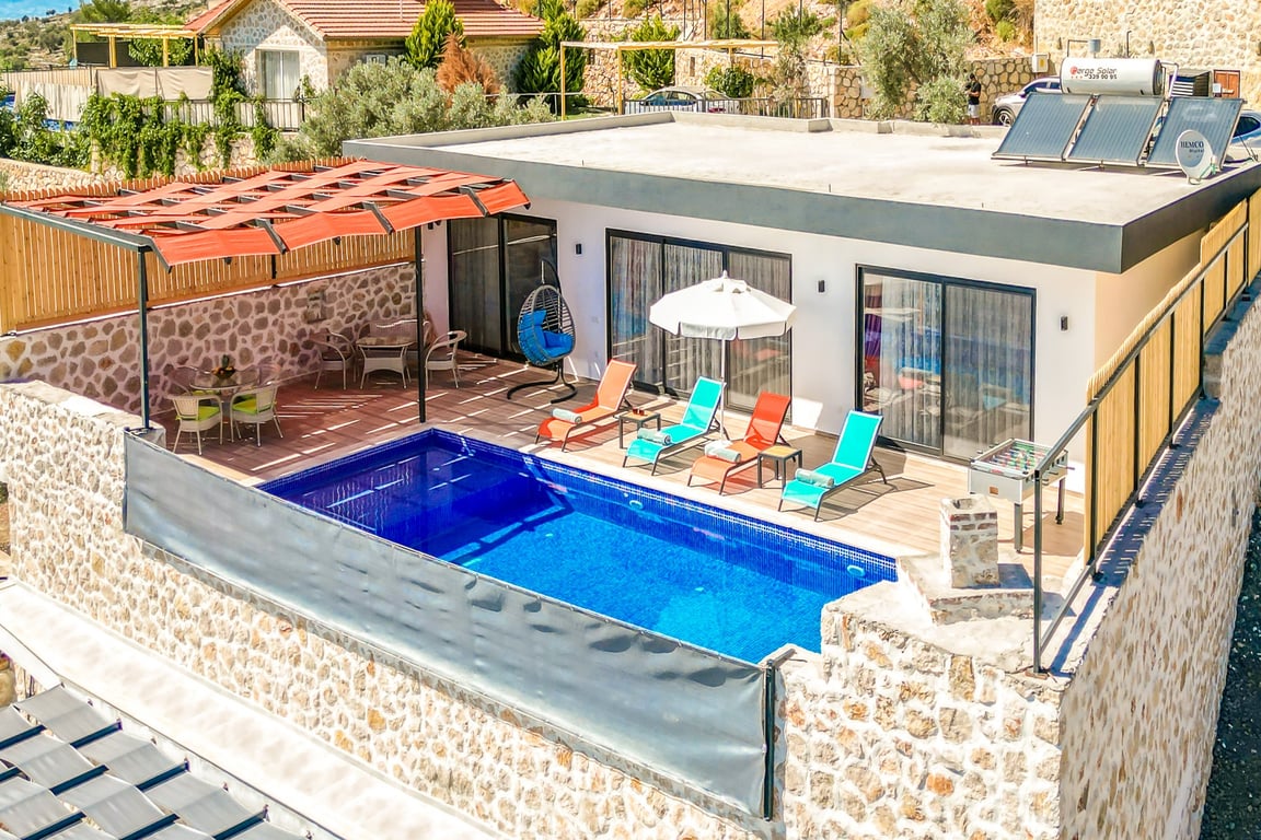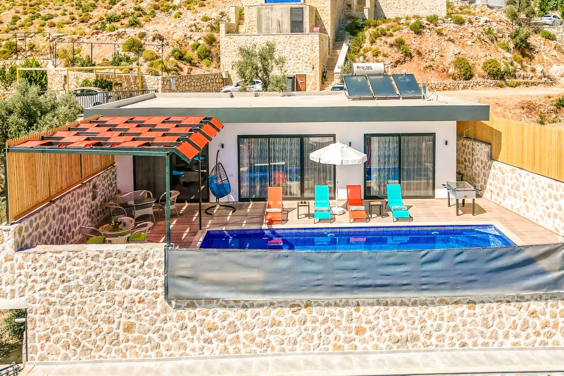 Villa Antik Allure, Kalkan İslamlar bölgesinde konumlanmakta olan yeşilliklerle kaplı doğa manzarasına hakim kiralık villalarımız arasında yer almaktadır. Konforlu ve modern bir şekilde dizayn edilen villamızda 2 adet yatak odası bulunmakta olup, 4 kişiye konaklama imkanı sağlamaktadır. Yatak odalarından bir tanesinin içerisinde tüm yılın vermiş olduğu yorgunluğu giderebileceğiniz jakuzi yer almaktadır. Villamız balayı çiftleri ve çekirdek aileler için uygundur. Havuz ve havuz terası korunaklı hale getirilen yazlık villamızı muhafazakar aileler gönül rahatlığı ile tercih edebilirler. Hayallerinizin de ötesinde keyif dolu bir yazlık villada tatil için Villa Antik Allure’ yi tercih edebilirsiniz.